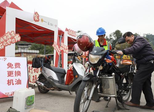 为保障春节期间车辆安全出行,广西石油在全区主干道沿线的100座加能站开设情暖驿站服务点,提供热姜茶、速食、应急药品、简易维修工具等暖心服务,并在部分站点推出免费更换机油、爱心义剪等特色项目。图为近日广西梧州石油情暖驿站志愿者为出行车辆更换机油。 黎 菲 摄 韦 夏 文