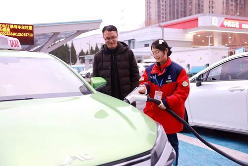 安徽石油建立实时信息联动机制,及时掌握各站点车流和充电需求,为重点充电站安排专人引导,全力保障春节期间新能源车主绿色出行。图为2月23日正月初七,合肥石油大众综合加能站员工为客户提供充电服务。本报记者 孙德荣 摄