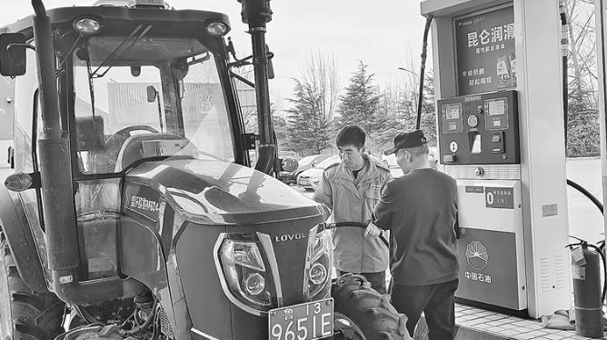 图为加油员为农机车辆加油。