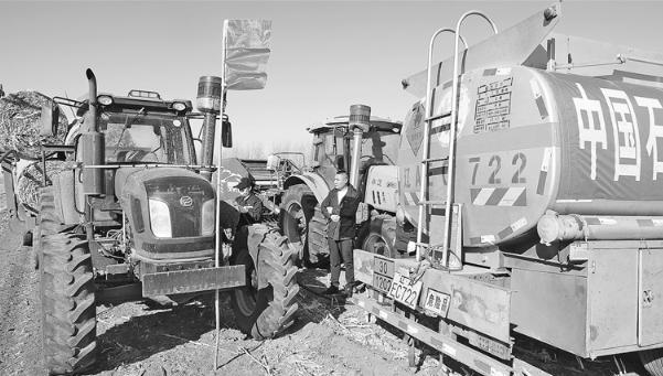 图为小额配送车辆将油品送到田间地头。