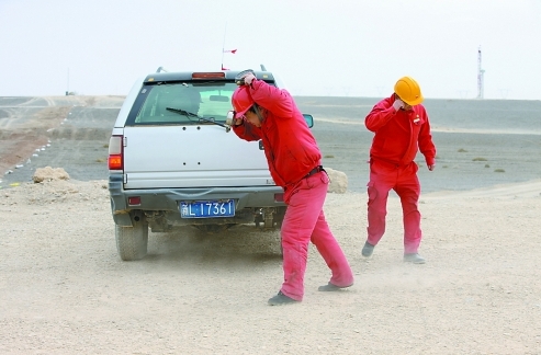 3月20日上午,记者从吐哈油田前线基地鄯善奔赴100公里外的红台采气工区。一路上黄沙弥漫,天昏地暗,能见度很低。越野车刚进入红台地域的边缘,沙尘就像变魔术一样突然消失了,眼前视野开阔起来。人在车里,听到的是冲击着耳膜的呼呼风声,似鬼哭狼嚎一般。越野车被强大的风力吹得来回摇摆,卷起的沙砾噼噼啪啪击打着车身。"这不算厉害,红台里面的风比这更邪乎。"同行的丘东采油厂宣传干事张洪林话音刚落,迎面驶过来一辆挡风玻璃几乎碎光的拉油罐车。只见司机戴着棉军帽,将脸包裹得很严实。