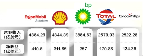 对以上5家公司2011年财报的统计结果显示,它们去年的营业收入和净收益都出现了大幅增长,BP还实现了漏油事故后净收益的首次正增长。2011年,5大公司共实现净收益约1275亿美元,比上一年增长75%。其中,埃克森美孚是最大赢家,全年共实现净收益401亿美元,比上一年增长近35%,约占5大公司净收益总额的1/3;其次是壳牌和BP,净收益分别为312亿美元和257亿美元;道达尔和康菲略逊于前三者,但净收益也分别高达171亿美元和124亿美元。
