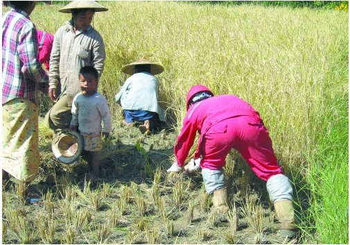 机组员工主动帮助当地村民收割水稻。