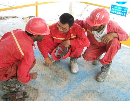 泥浆工程师杨恩录与外方员工在施工现场交谈。(徐小刚摄)