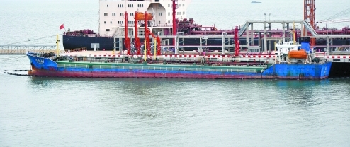 建桥518号油船停靠在泊位上装油。(项羽/摄诺亚/文)