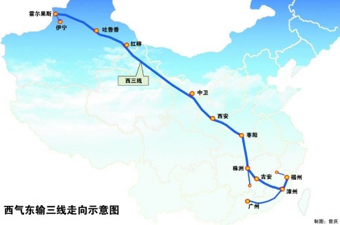 西气东输三线是国家能源重大干线管网工程,包括一条干线、五条支干线和三条支线。干线西起新疆霍尔果斯,东至福建省福州市,全长5220公里,途经新疆、甘肃和宁夏等10个省区。管线设计输气能力年300亿立方米,气源来自中亚,预计2015年全线投产。届时,三条西气东输管线将与陕京一线和二线,以及川气东送管道,共同组成国内横贯东西和纵穿南北的综合天然气管网,缓解国内多个省市的天然气供应紧张状况。