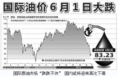 当地时间6月1日,受美国就业数据疲软和欧洲债务危机担忧拖累,与国内成品油调价挂钩的伦敦市场北海布伦特油价,早盘7个月以来首次跌破每桶100美元的重要心理关口。截至美国东部时间上午10时50分,北海布伦特原油7月期货价格大跌3.13美元,至每桶98.24美元。业内人士认为,受国际油价连续下跌的影响,国内成品油价格将有望在近期迎来今年的第二次下调,每升成品油的价格将回到8元以下,而未来一段时间里原油市场下跌趋势难有大的改观。