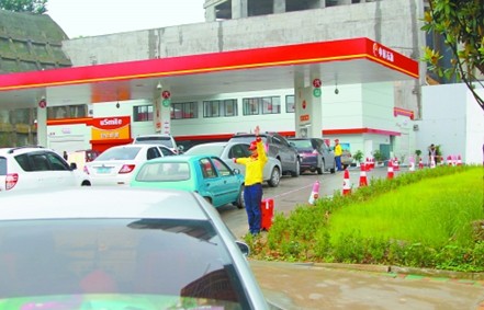 图为观山加油站员工引导车辆有序进站加油。记者金添摄