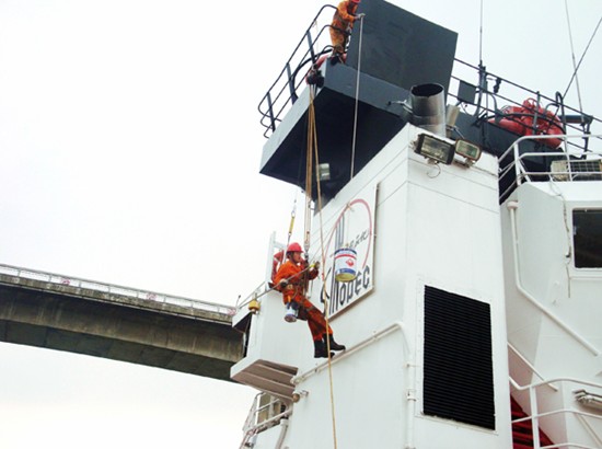 6月9日1时30分,勘探六号抵达距离装船点1.5海里处,4时,换拖作业完成,并由3条机动性很强的港拖拖轮接手最后的装船作业。上午9时20分,3条港拖拖轮在经验丰富的船长指挥下,相互协调,拖带勘探6号稳稳地来到干拖船右舷50米处,与此同时,已经完成下潜的干拖船开始放缆。9时45分,干拖船的4根绞缆全部交叉带好,随即开始最后的装船作业。随着干拖船上4台绞缆机的协调配合以及港拖拖船的协助,平台缓慢而稳定地抵住了干拖船上的2个定位桩,精确定位完成,干拖船开始起浮,10时40分,干拖轮浮出水面,平台完全坐在了干拖船上,装船成功。