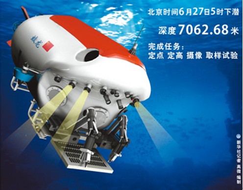 北京时间6月27日11时47分,中国"蛟龙"再次刷新"中国深度"--下潜7062米。6月3日,"蛟龙"出征以来,已经连续书写了5个"中国深度"新纪录:6月15日,6671米;6月19日,6965米;6月22日,6963米;6月24日,7020米;6月27日,7062米。