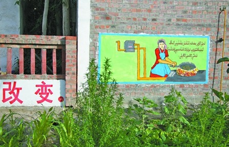 村头墙上乡民们自绘的宣传画,讴歌幸福新生活。和田地区所属的洛浦县是贫困县,当地百姓和农牧民使用上天然气后,真正尝到了党和国家"天然气利民工程"和"富民安居工程"的甜头。