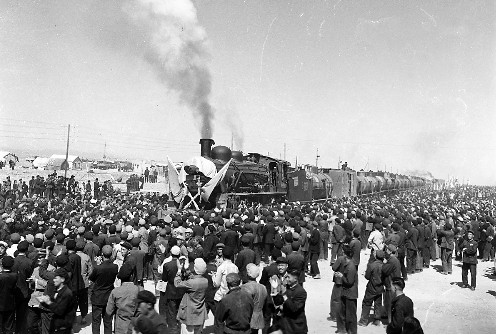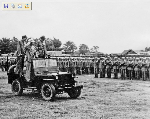 1952年8月1日,中国人民解放军第19军第57师奉命改编为石油工程第一师。师长张复振(汽车上,右)、政委张文彬(左)、陕西省军区政治部主任牛书申检阅部队。