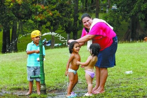 午后,奥达斯市市民在公园里玩水嬉戏。