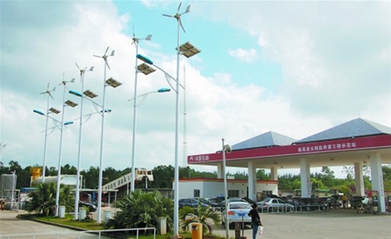在临高加油加气站,顶棚是由太阳能电池板搭建,一排6杆风光电互补路灯,可实现风能和太阳能双用。这是一座“绿色”到每个角落的能源补充站。加油加气站站长刘瑞祥说,来自太阳能和风能的用电量,能占这座站用电量的一半。他还略显得意地指着加气站顶上的大字提醒我们:“这座站每年还赞助临高县希望工程10万元。”