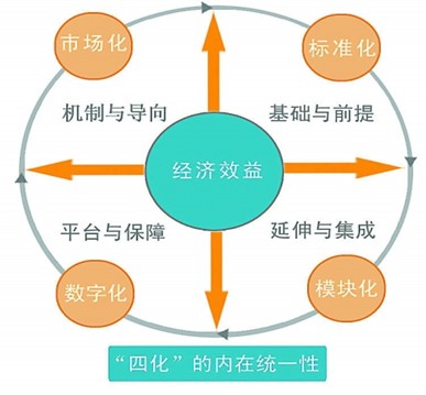 “四化”管理模式是指设计标准化、建设模块化、运作市场化和管理数字化。以“四化”为内容的油气田开发建设模式成为成就大油气田的绝妙之笔。“四化”管理模式推动长庆油田公司由传统工业向新型现代化工业的成功转型。目前,“四化”管理模式已应用于长庆油田建设的各个环节。