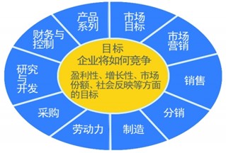 轮盘处是企业总目标(利润增长、市场份额、社会效应),关于企业要如何从事竞争及特定的经济与非经济目标的笼统目标。