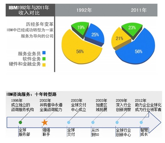 2011年IBM宣布:其23%的收入来自软件,21%的收入来自硬件,而来自服务的收入已占到56%。这是IBM转型路上的标志性路标。