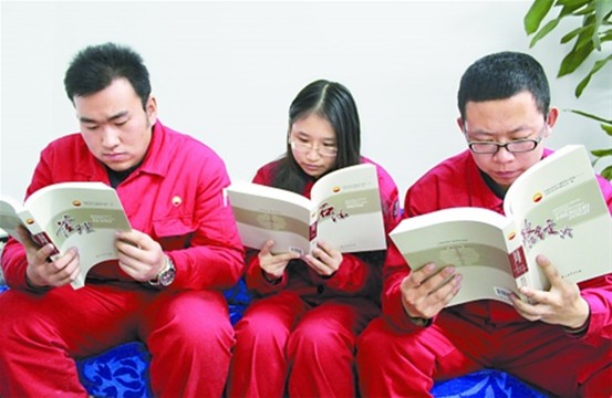 图为采油员工在阅读《中国石油员工基本知识读本》