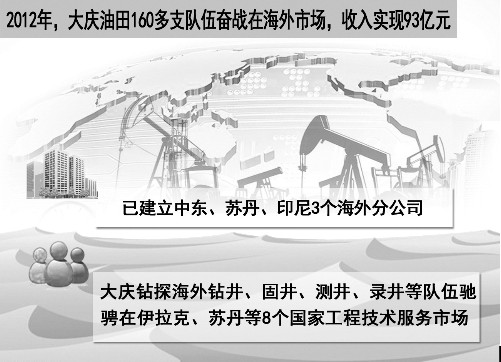 2012年,大庆油田海外市场捷报频传,创收节节攀升,160多支队伍奋战在海外市场,海外业务规模效益再创历史最高水平,收入实现93亿元。