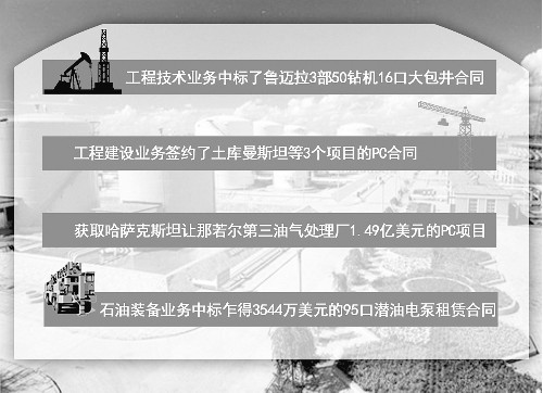 去年,大庆油田工程技术业务中标了鲁迈拉3部50钻机16口大包井合同;工程建设业务签约了土库曼斯坦等3个项目的PC合同,并获取哈萨克斯坦让那若尔第三油气处理厂1.49亿美元的PC项目,拿回了中亚地区工程建设业务最大合同;石油装备业务中标乍得3544万美元的95口潜油电泵租赁合同。
