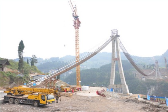 乌江跨越悬索桥主跨跨度为310米。主缆吊装的桁架上,将同时敷设中贵管道和中缅原油管道。在施工过程中,施工方管道一公司采用了新施工技术——预制索股法。