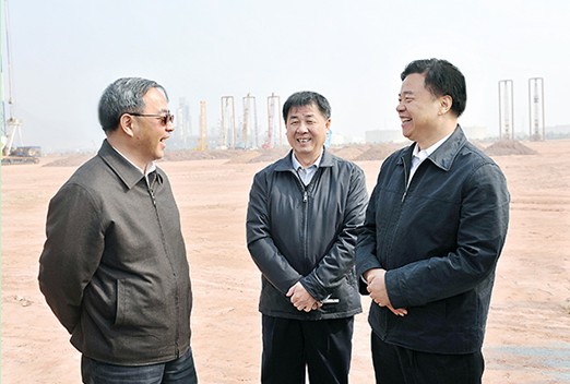 王宜林(右一)在惠州炼化二期现场向胡春华(左一)介绍项目建设情况。