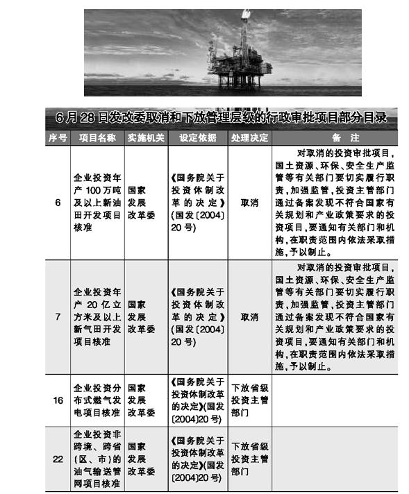 6月28日,国家发改委在其官方网站上公布取消和下放管理层级行政审批项目26项,其中,取消行政审批项目14项,下放管理层级行政审批项目12项。这是时隔一个多月之后,根据5月15日《国务院关于取消和下放一批行政审批项目等事项的决定》发布的新通知,其中多项与油气行业相关。