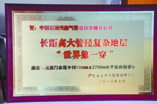 在珠海LNG输气管道西干线项目崖门水道定向钻穿越工程竣工仪式上,广东省天然气管网有限公司授予中国石油管道局穿越公司“长距离大管径复杂地层‘世界第一穿’”牌匾。