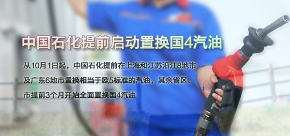 按照国家统一要求,2014年1月1日起国内将全面执行国4汽油标准。中国石化8月28日发布消息称,中国石化正积极行动,优化所属炼油企业汽油质量升级时间表,将从10月1日起,提前在上海和江苏沿江8地市及广东6地市开始置换相当于欧5标准的汽油,其余省区、市提前3个月开始置换国4汽油。