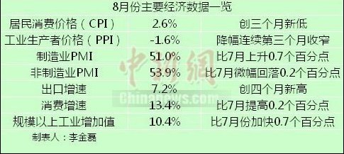 此外,PPI同比降幅缩小为1.6%,比7月份收窄了0.7个百分点,降幅连续第三个月收窄。同时,在多项经济指标回暖的同时,物价水平却一直在低位徘徊。数据显示,8月CPI同比上涨2.6%,涨幅创下3个月新低。