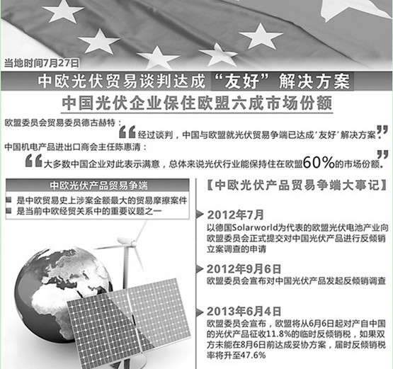欧洲议会国际贸易委员会成员丹尼尔·卡斯帕瑞对本报记者表示,中欧之间一天的贸易量就超过10亿欧元,不愿看到中欧互挥大棒。欧洲国际政治经济中心主任埃里克松在接受本报记者采访时说,6月以来光伏案的事态进展,让欧委会已无退路。一旦让步,既丢面子又可能被主控企业告到欧洲法院,而现在终于达成协议了。