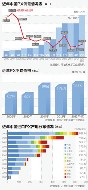 分析近年来数据,造成我国PX需求缺口巨大的主要原因有两个。“一、我国是纺织生产和出口大国,下游PTA产能从2000年的200多万吨发展到2012年的3200多万吨,导致对PX的需求大增。二、PX事件引发的争议,使政府和企业决策更加慎重,放弃或缓建PX项目,导致PX产能发展滞后。”中国石油与化学工业联合会副会长李润生认为。