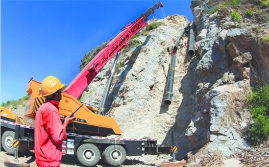 1B标段一号陡崖布管施工。