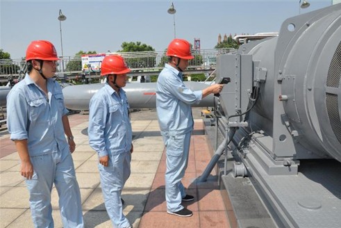图为8月5日管道公司大榭岛油库正在用红外线测温仪测试运行中的外输泵电机外壳及润滑油温度,根据测试结果,提前为输油泵及电机制定“凉策”。