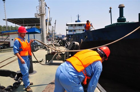 图为8月7日一艘满载柴油的油船即将离港