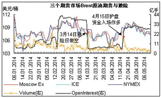 为了预防国际游资打压Brent油价,冲击俄财政预算。从避险日开始,俄罗斯石油界的金融财团在莫斯科交易所对石油和天然气指数期货、金融型Brent原油期货做空,为原油实物头寸避险,同时增加了相关期货期权的交易,有效地锁定了俄罗斯油气企业的经营风险。国际财团测算出莫斯科交易所的交易意图后,逐渐罢手,并放由油价回归其原有的价值区间。于是,在4月15日后,俄财团再次开始增资做多。通过石油金融资本在莫斯科交易所交易,不仅有效规避了俄油气企业经营的价格风险,也消除了国际游资通过阻击Brent油价达到对俄财政和经济冲击的企图。