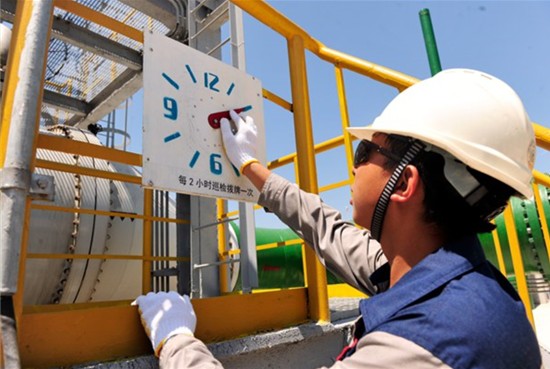 浙江LNG工艺区设备每两小时就要巡检一次,巡检完毕后将钟表指针往后拨两小时,是巡检人员每天必做的。(记者李佑坤摄)