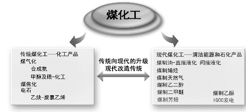 在2013年亚洲石化科技大会上,中国石油和化学工业规划院副院长白颐介绍,现代煤化工和传统煤化工既有区别又密切联系,传统煤化工生产石化产品,现代煤化工则正在朝清洁能源和石化产品并重方向发展。现代煤化工以传统煤化工为基础,在规模和技术水平上有了大规模提升,现代煤化工产业发展将带动传统煤化工转型升级。
