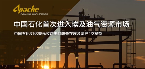 北京时间2013年8月30日,中国石油化工集团国际石油勘探开发有限公司与美国阿帕奇石油公司(ApacheCorporation)宣布双方正式建立全球战略合作伙伴关系。作为战略合作第一步,双方签署协议由中国石化收购其埃及油气资产1/3权益,收购价格31亿美元。该交易尚需得到相关部门的批准。