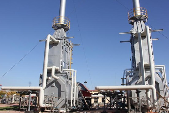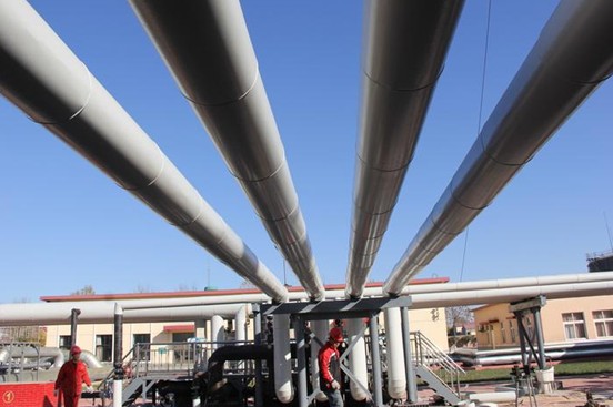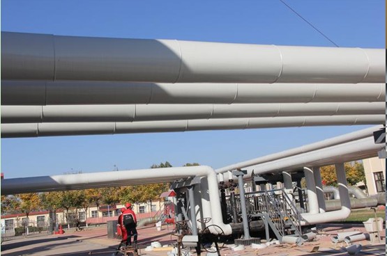 图为东光输油站更换输油工艺管线保温层已收尾结段1#2#加热炉前输油工艺管线全景