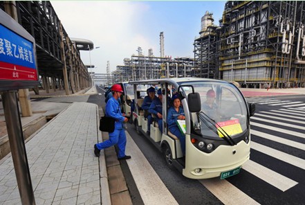 在四川石化炼化一体化项目装置区,十几辆电动车来回穿梭,深受员工喜爱,员工们亲切地称它为“招手停”。截至目前,四川石化厂内送餐车、叉车、巡逻车等近百辆车纷纷加入了电动节能、绿色环保行列。