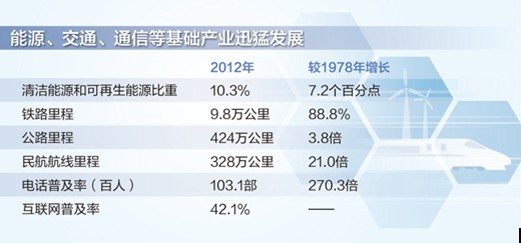 从无到有的高速铁路,仅仅是改革开放以来我国基础设施迅猛发展的一个缩影。短短35年,我国的能源、交通、通信等基础产业已取得举世瞩目的成绩。“中国修路、架桥、打隧道等建设水平和能力,令世界惊叹。中国从一个基础设施严重落后的国家,奇迹般地成为基础设施最先进的发展中国家,在有些方面甚至可与发达国家媲美。”中国社会科学院工业经济研究所所长金碚说。