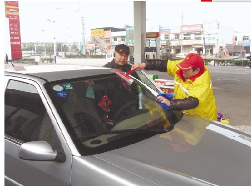 图为茂源加油站员工为客户擦洗车窗。