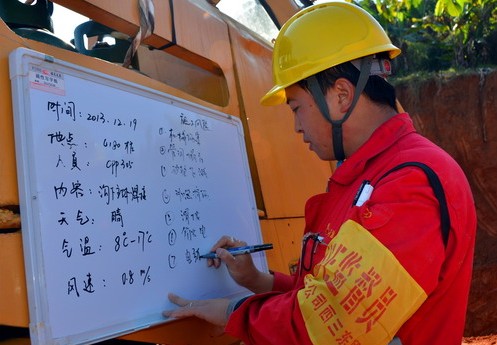 安全员在安全风险提示板上填写当日气温、风速,供焊工参考,确保焊接质量不受天气因素影响。