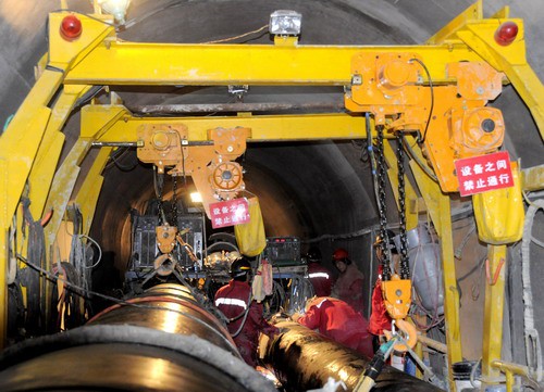 隧道内进行管道安装。