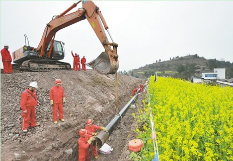龙王庙气藏内输工程于去年3月开始建设,当年底完工9条采气管线,长60余公里。川庆油建川中分公司经理李庆刚介绍:“今年将再建16条采气管线,长90余公里。为确保今年8月建成投产,分公司早安排、早部署,除当天打火动工的这条管线外,还有7条管线的土建已提前动工。”