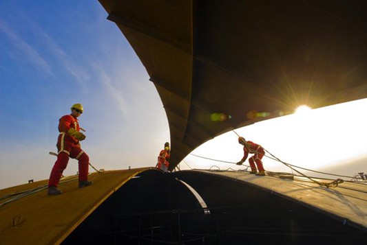 图为2月28日,在海洋采油厂海四联合站,4号储油罐罐顶钢板更换施工正在紧张进行
