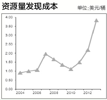 2010年来,新增储量的曲线走向在达到最高点后,开始走上与不断高企的评估支出曲线相反的路径。近3年,发现成本连续激增,2013年新增储量发现成本保持在3美元/桶。