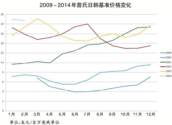 从2009年到2014年的6年间,日韩基准价一直平稳上升,虽然其中小有跌落,但仍然无法阻止它一路上扬的步伐。2009年6月,天然气日韩基准价仅为不到4美元/百万英热单位,如今,该价格已经增了近5倍。“亚洲溢价”有愈演愈烈之势。