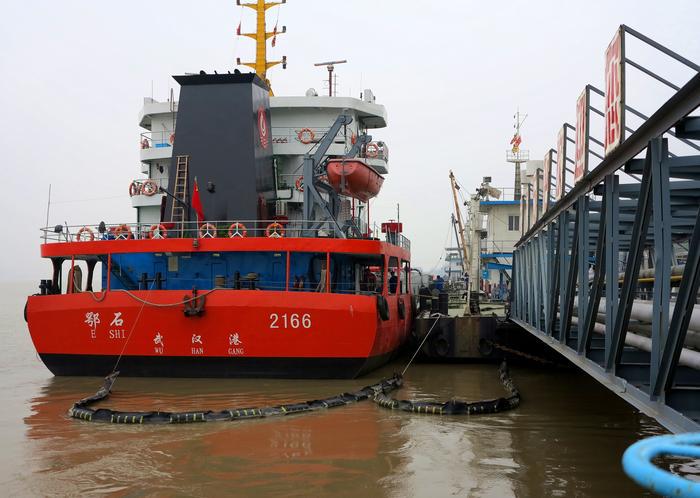 安庆石化港贮部码头承担着原油、成品油以及化工产品的水路输转任务。多年来,该部以防水体染为重点,不断强化危化品码头管理,严格规定当船驳靠上码头后,立即在船尾带上围油栏,防止在油品输转中出现泄漏造成水体污染。图为4月25日,正在向油轮付油中的安庆石化3#码头。